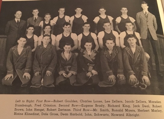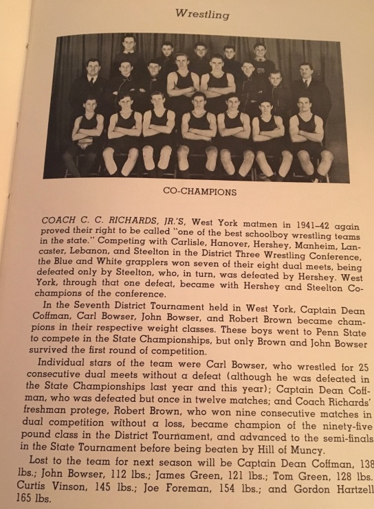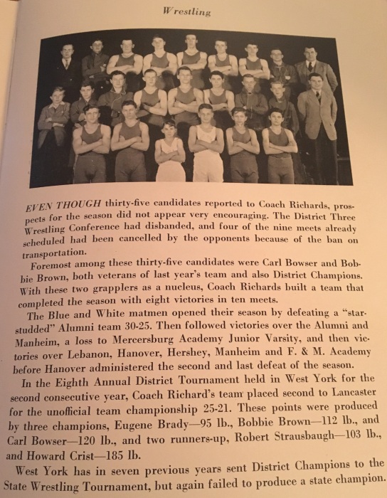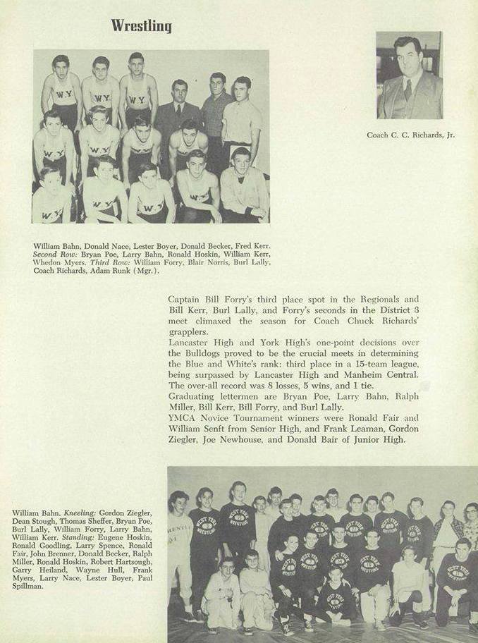 AN ALUMNI WEBSITE LOOK BACK... "A Wrestler must LIVE Wrestling!" ▪▪ Paul C. McCleary's Wrestling Shoes... & West York Wrestling Robe from 1948. 1940's WEST YORK WRESTLING w/Paul C. McCleary & Whedon Myers submitted by K.C. McCleary, Pat McCleary & Kyle Miller 1940's West York Wrestling ![]() Coach Charles C. Richards, Jr. ![]() Coach Chuck Richards (138-111-7) 1941-42 West York Wrestling ![]() 1942-43 West York Wrestling ![]() 1943-44 West York Wrestling ![]() 1944-45 West York Wrestling ![]() 1945-46 West York Wrestling ![]() 1946-47 West York Wrestling ▪ West York's Paul C. McCleary is seated left - 2nd Row...(no shirt) West York HS Coach - Chuck Richards, is far right - 3rd row. • Other WY'ers in above photo include... Lee Zellers, Leon Senft, Herb Marley, Johnny Schwartz, Dean Harbold, William Grimmon, Robert Grube, John Smith, Herb Schmidt, Robert King & Paul Brodbeck. (Varsity) • 1947 PIAA State Wrestling 165lb. Finals Frank Rich (Lock Haven) dec. Robert King (West York) 2-0. 1947-48 West York Wrestling ▪ West York's Paul C. McCleary is seated far left - 2nd Row... West York HS Coach - Chuck Richards, is far right - 4th row. •• Other WY'ers in above photo include... Lee Zellers, Jake Zellers, R. Barley, Leon Senft, Herb Marley, Dean Harbold, Ault, Gross, Bob Grube, Stambaugh, Herb Schmidt & Nolan Hengst. (Varsity) WEST YORK YEARBOOK '48 ![]() 1948-49 West York Wrestling Front Row (L-R) Edgar Swartz, Gene Wise, Llewellyn Miller, Dale Bahn, Leon Senft, Paul C. McCleary, Lynn Harbold, Mark Reeves. 2nd Row (L-R) Russell Aldinger, John Bare, Wayne Miller, Elvin Clark, Glenn Miller, Philip Hoover, Austin Edgington, Richard Barley, David Hoover. ▪ The 3rd Row (L-R) ... Nolan Hengst, Donald Becker, Charles Smith, William Zech, Lester Mollison, Donald Nace, William Aldinger, Donald Rudisill. ▪ The 4th Row (L-R) ... Coach Chuck Richards, Harlan Mummert, Wilbur Klinedinst, Robert Miller, Jack Hayes, Gene Kessler, Whedon Myers. West York HS Coach - Chuck Richards, is far left - 4th row. Paul C. McCleary, Jr. above photos submitted by K.C. McCleary, Pat McCleary & Kyle Miller