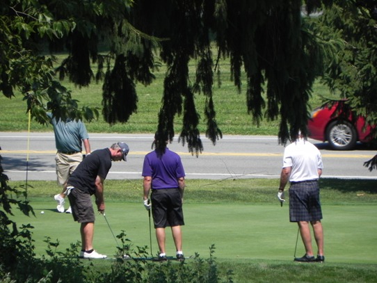 taking a shot while Steve Rubesch & Don Lehman look on.