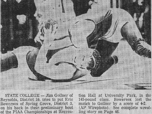 145lbs. George Myers (Dallastown) dec. Rick Lepley (Jenner Boswell) 10-4