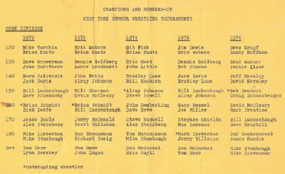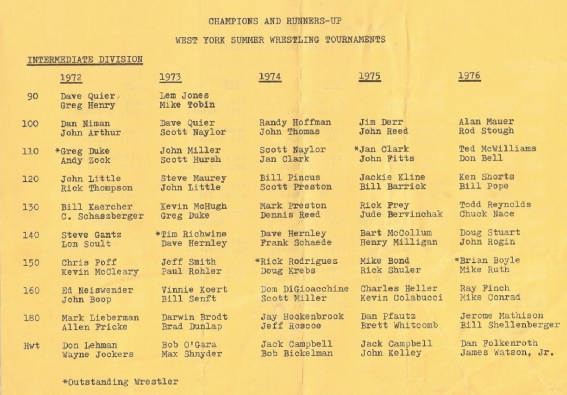 WRESTLING TOURNAMENT INTERMEDIATE (High School) DIVISION 1972 1973 1974 1975 90 Dave Quier Len Jones N/A N/A Greg Henry Mike Tobin N/A N/A